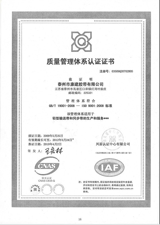 泰州市康建膠帶有限公司經過十多年的發展已經成為一家從事輸送帶和傳動帶類及相關設備生產和銷售的公司。位于中國經濟發達的長三角經濟圈江蘇省泰州市高港區,交通發達。我司以“合格的產品,滿意的服務”為宗旨,發揚團結、開拓、拼搏爭先的創業精神,“康建”在全國行業樹立了良好的企業形象。“康建”產品已通過ISO9001國際質量體系認證,從原料﹑工藝等方面進行了嚴格的控制,從而確保了產品質量的穩定可靠,成為各......